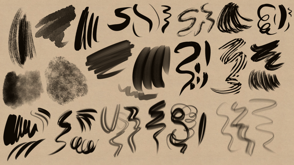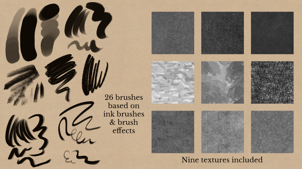 You get 26 brushes with nice inky brushwork effects, including split bristles and washes. You also get 9 textures + an extra I've released before, along with a guide on how to register them. They're meant for ink illustrations & paintings, but you can use them for general painting with a few tweaks as well.