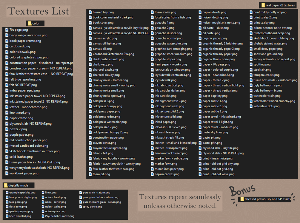 There are also 114 previously released textures formerly only available on the Clip Studio Paint Asset store. 46 of these are in color.