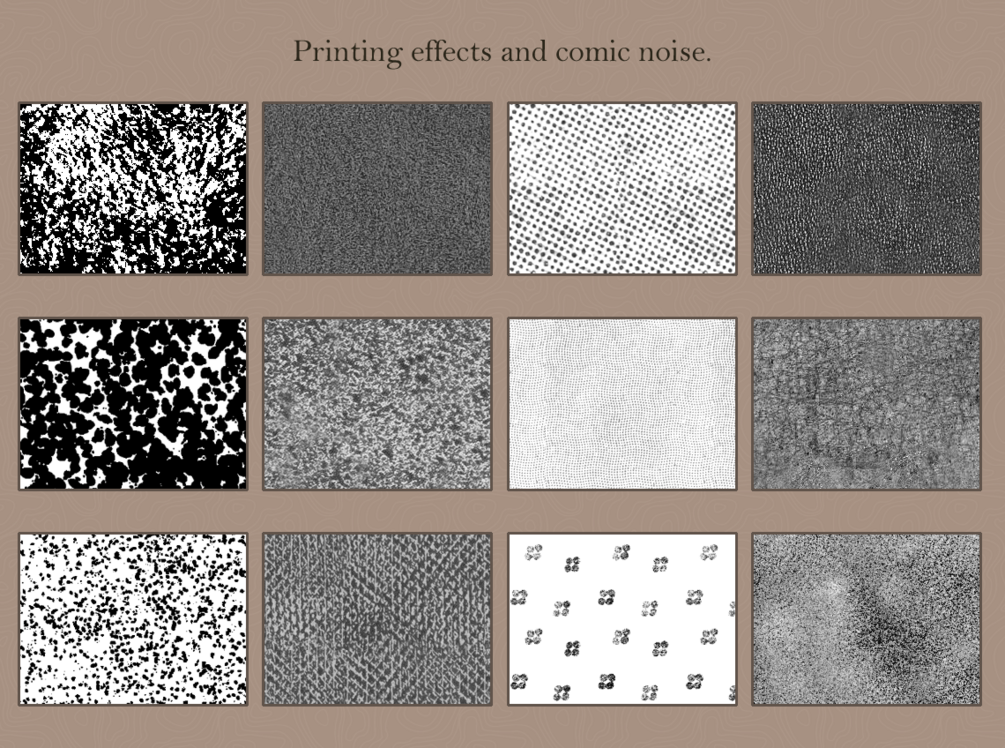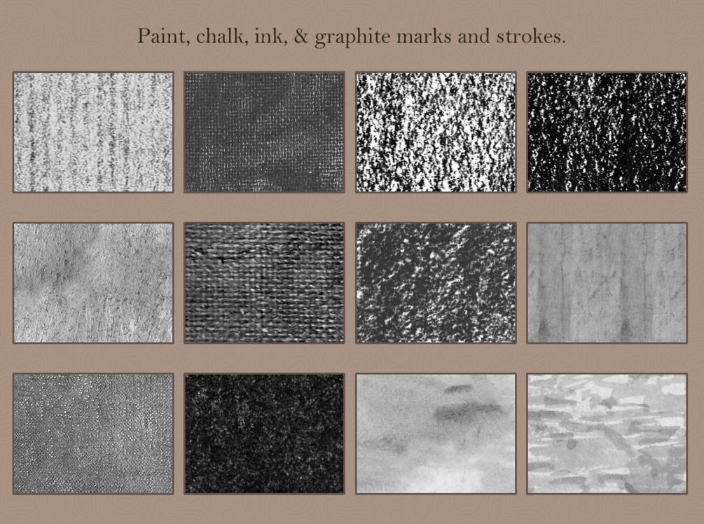• 16 digitally made textures. Simple things like grain and digital patterns like marbling are here. All seamlessly repeat.